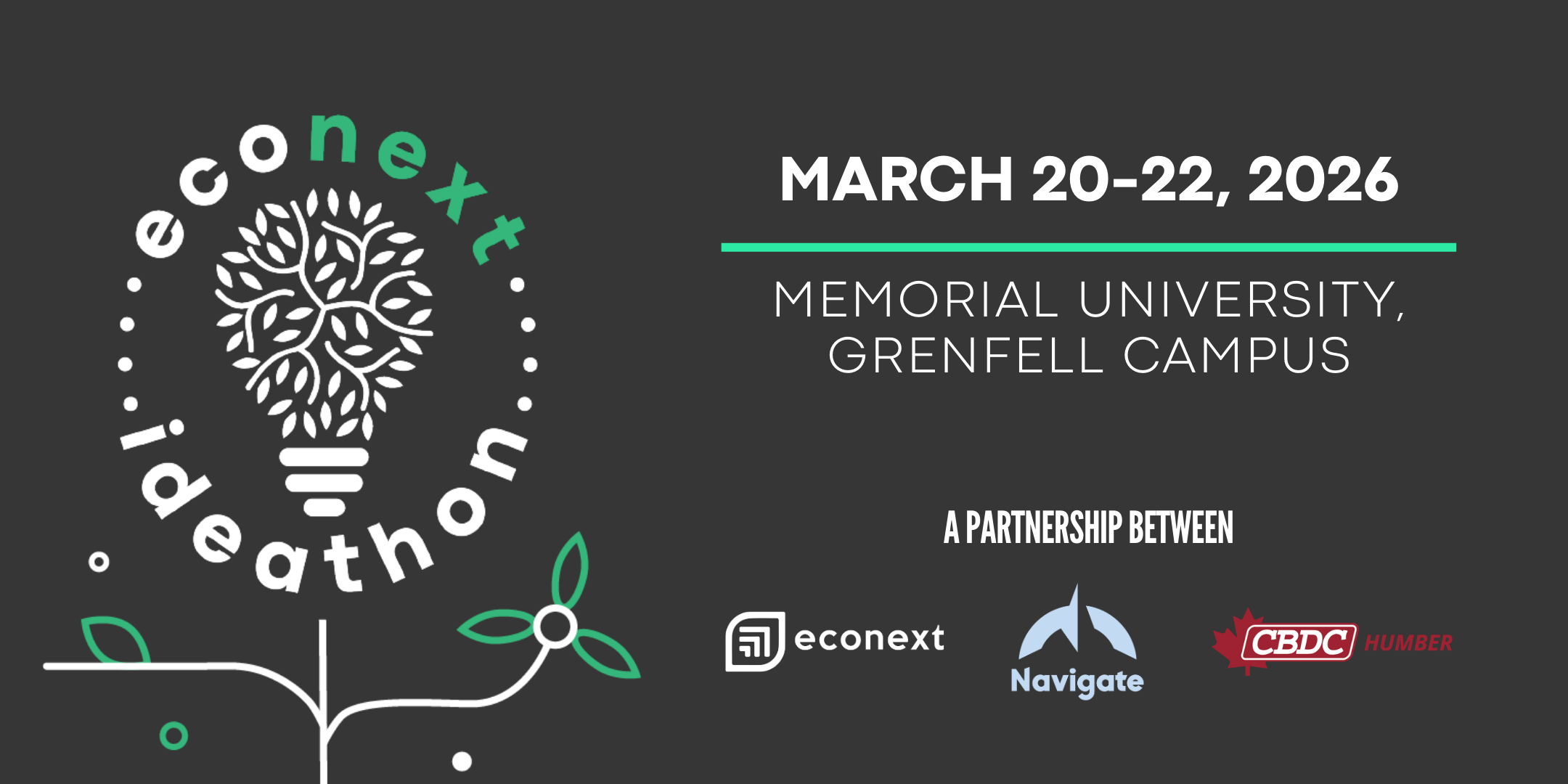 econext is excited to announce it’s next ideathon happening at Memorial University’s Grenfell Campus in Corner Brook! The weekend-long event, open to all MUN students, will be taking place in-person March 20-22, 2026.